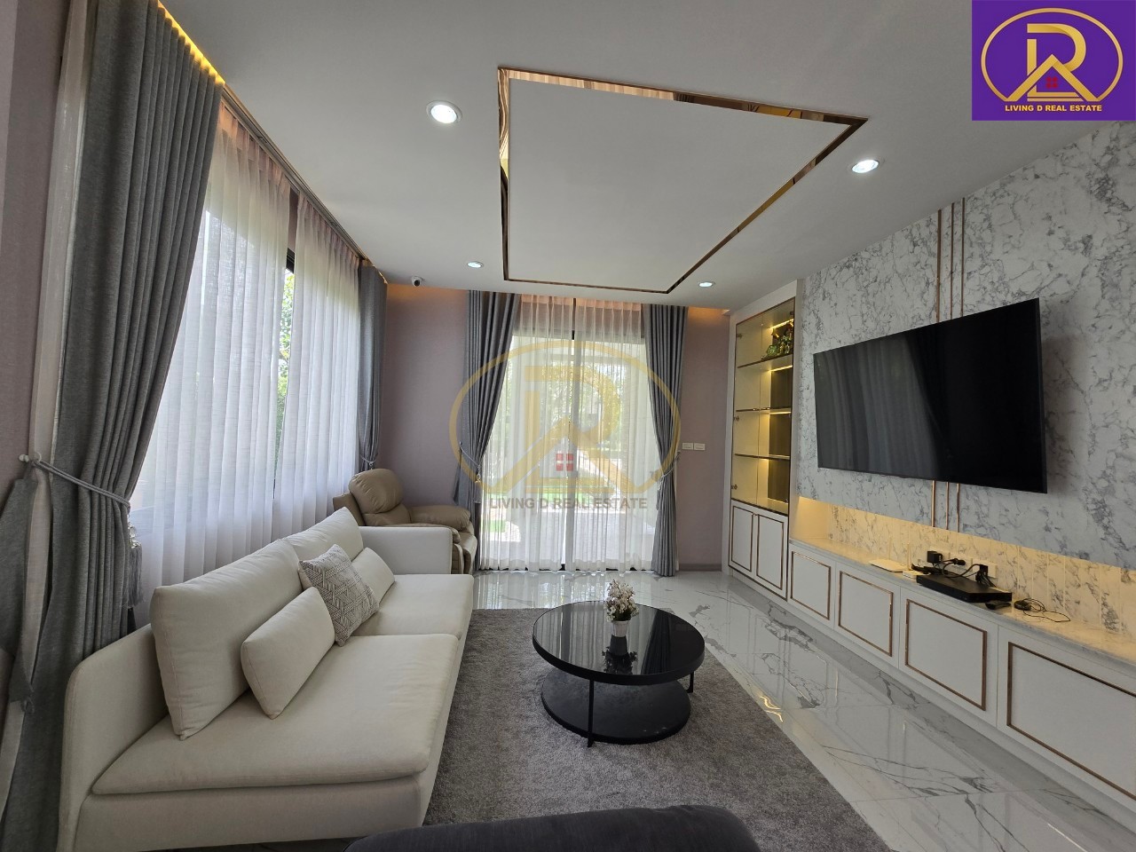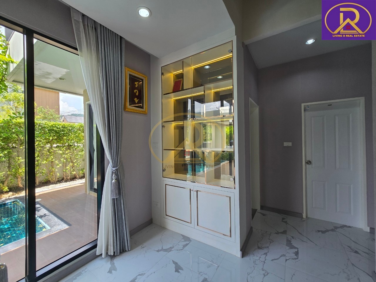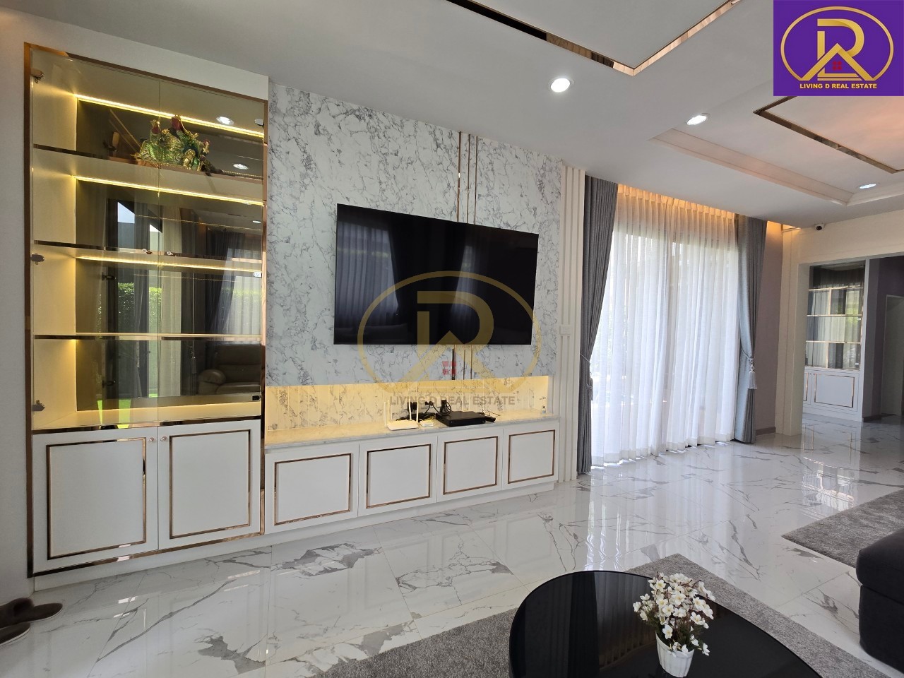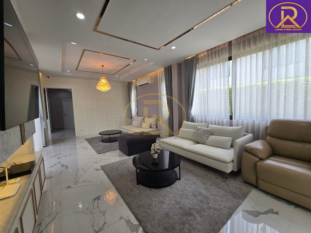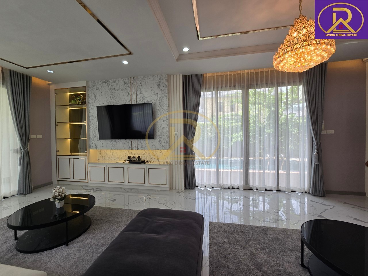 ห้องโถง : มุม รับแขก 2 มุม ทั้งมุมทีวี และมุมมองสระว่ายน้ำ, แถมโซฟา+โต๊ะกลาง พร้อมโซฟาไฟฟ้า 1 ตัว, บิ้วอินชั้นทีวีสวยหรู พร้อมแชนเดอเลียร์, แอร์